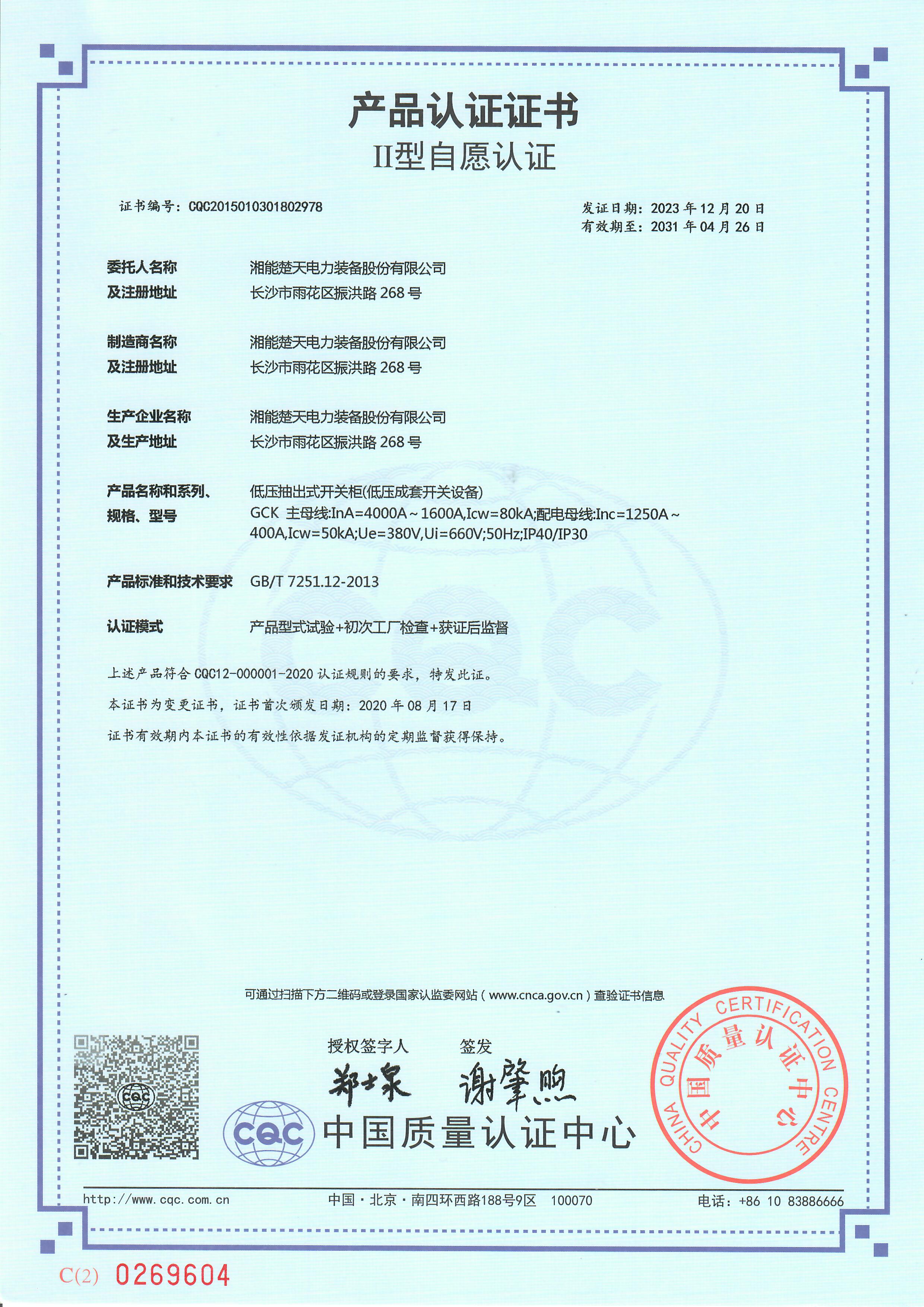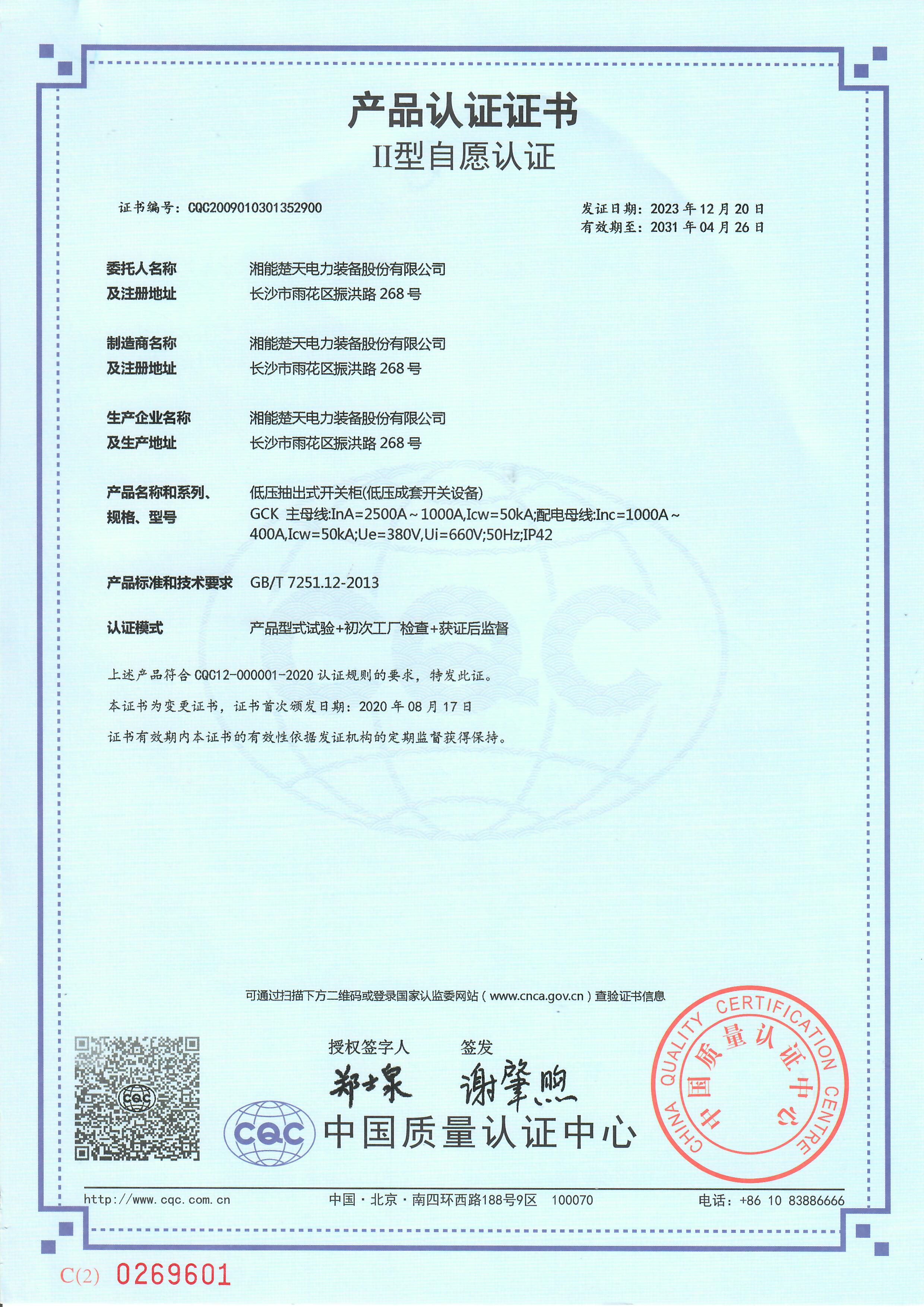 試驗報告( 低壓抽出式開關柜V2024CQC107501-1299855 GCK 2500A) -