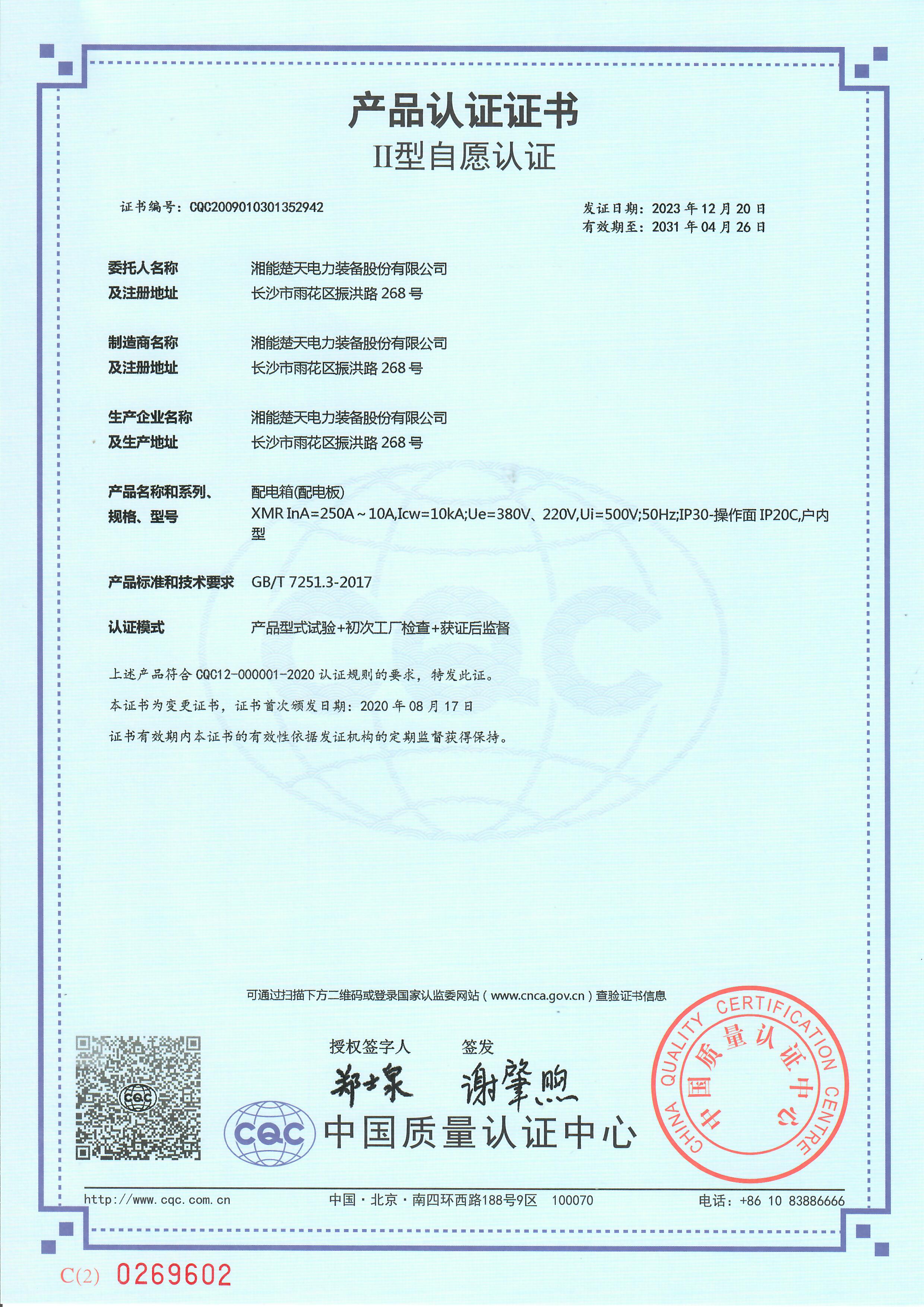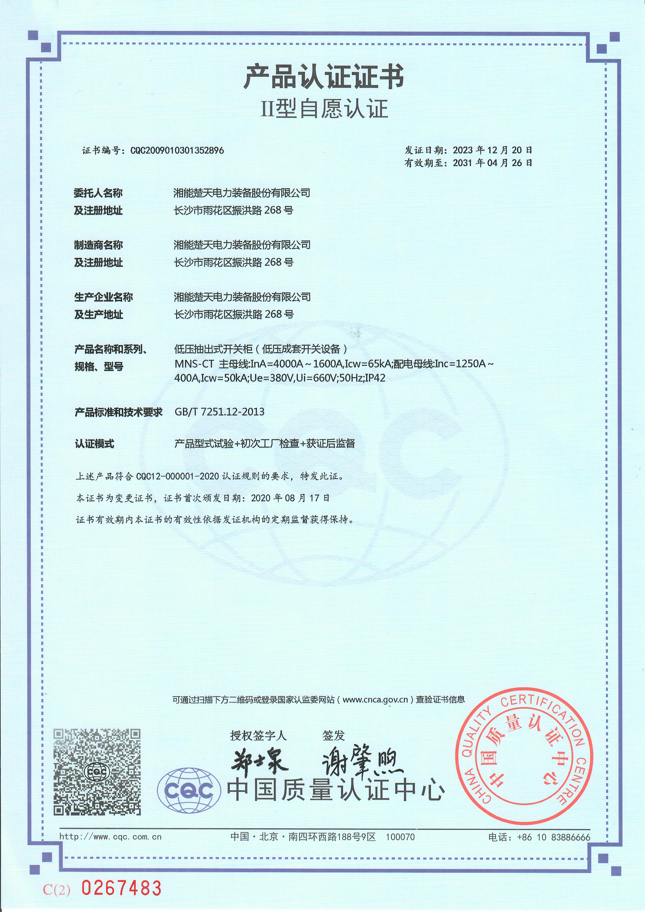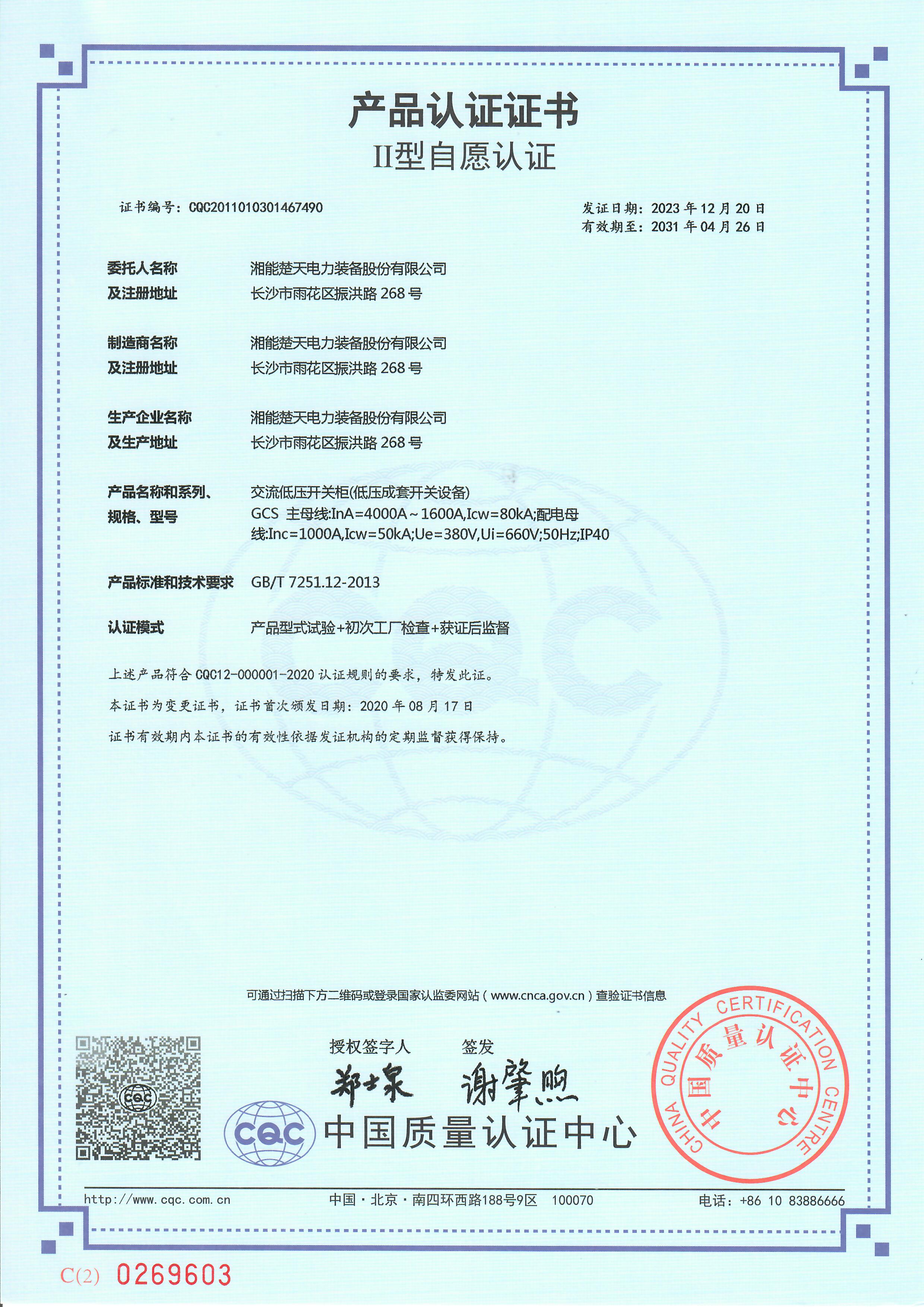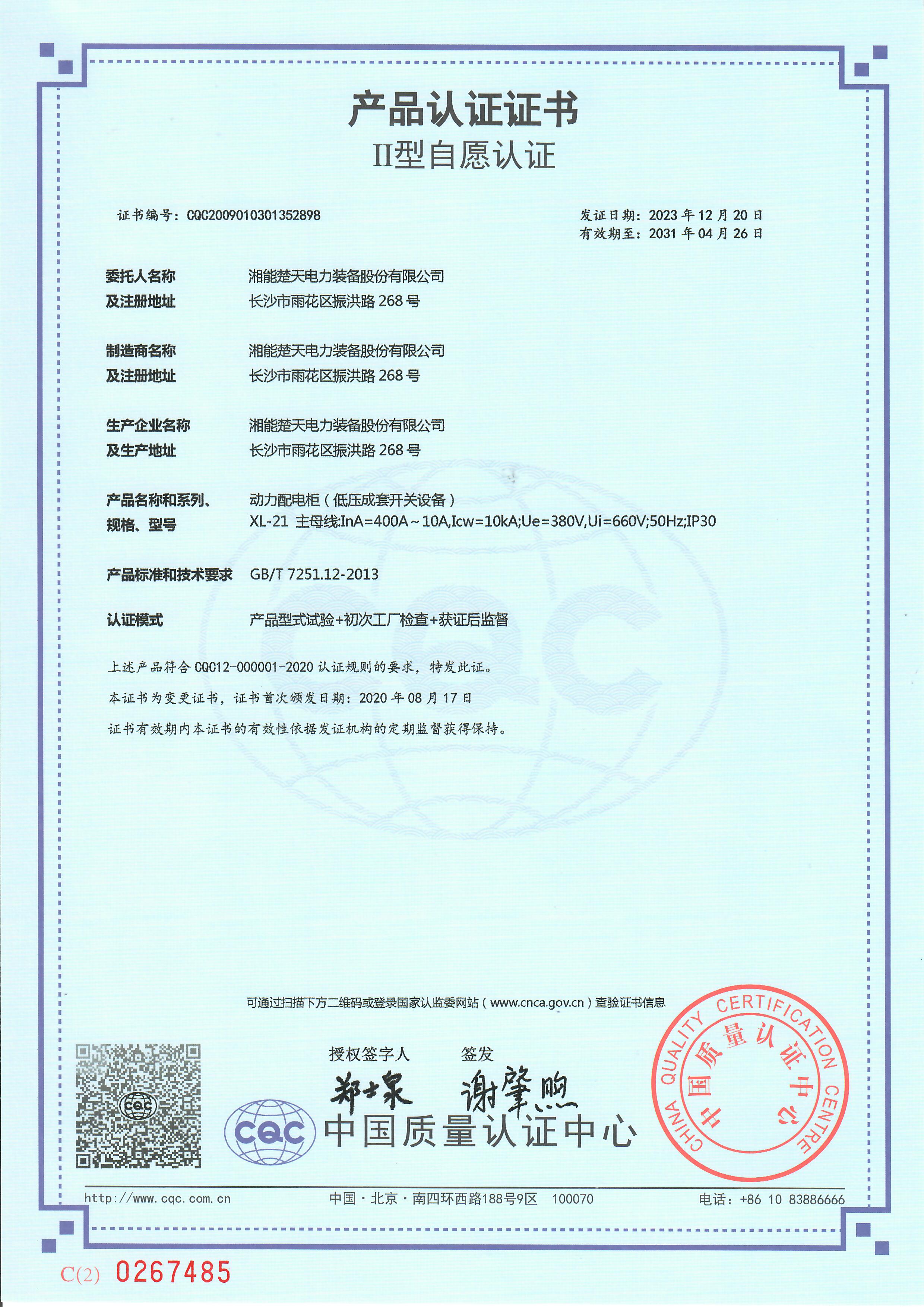 產品認證證書(開關設備和控制設備) -
