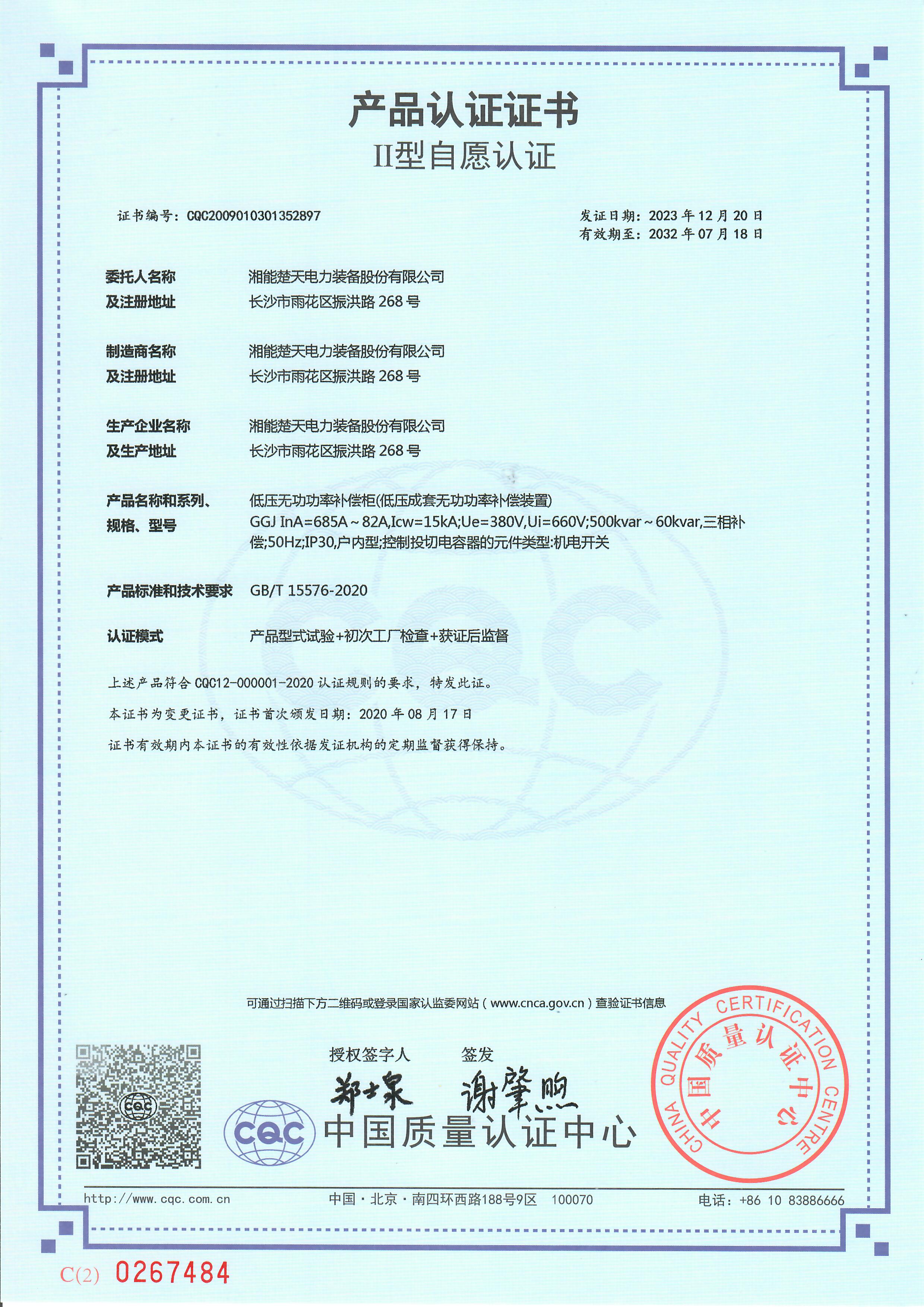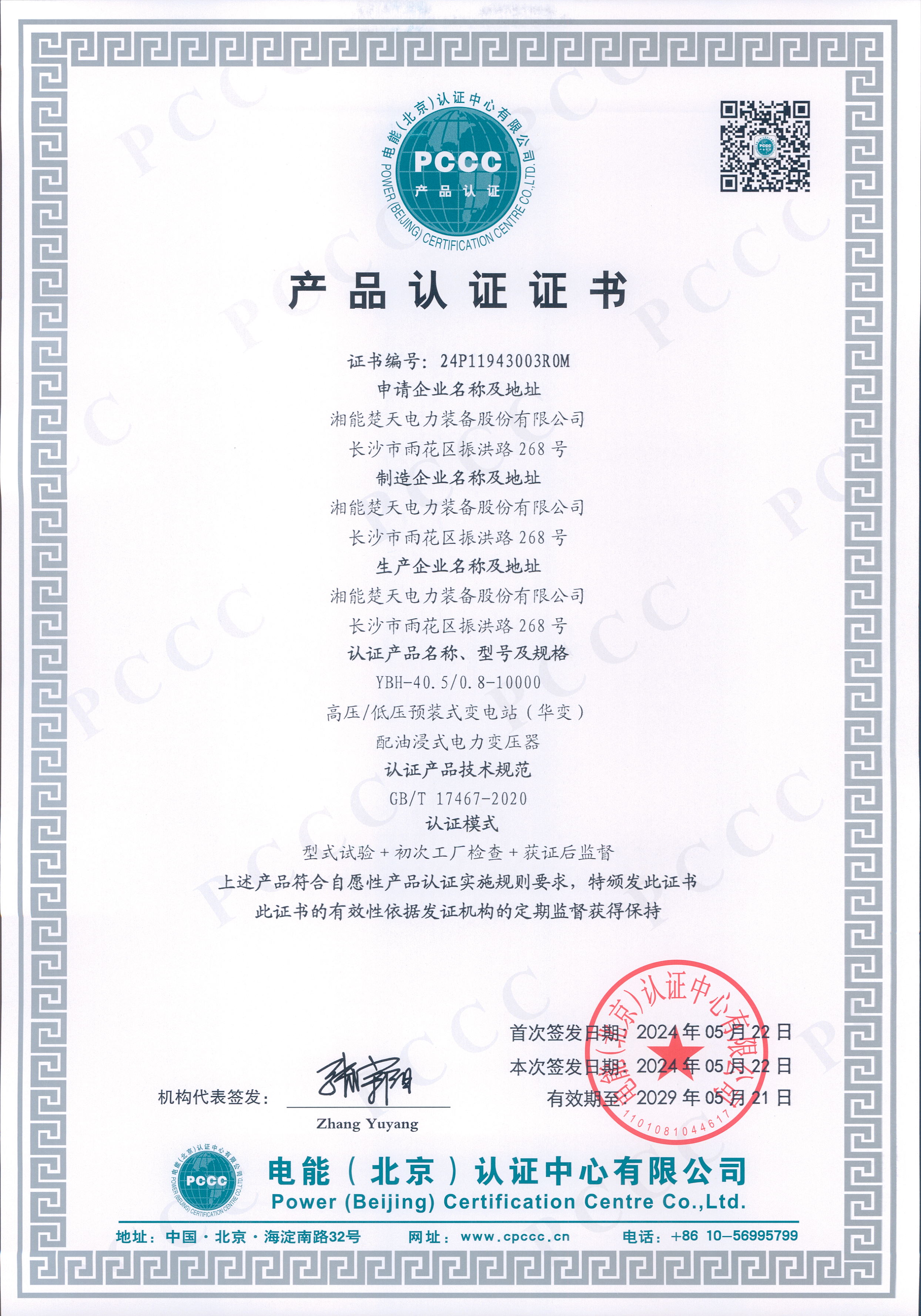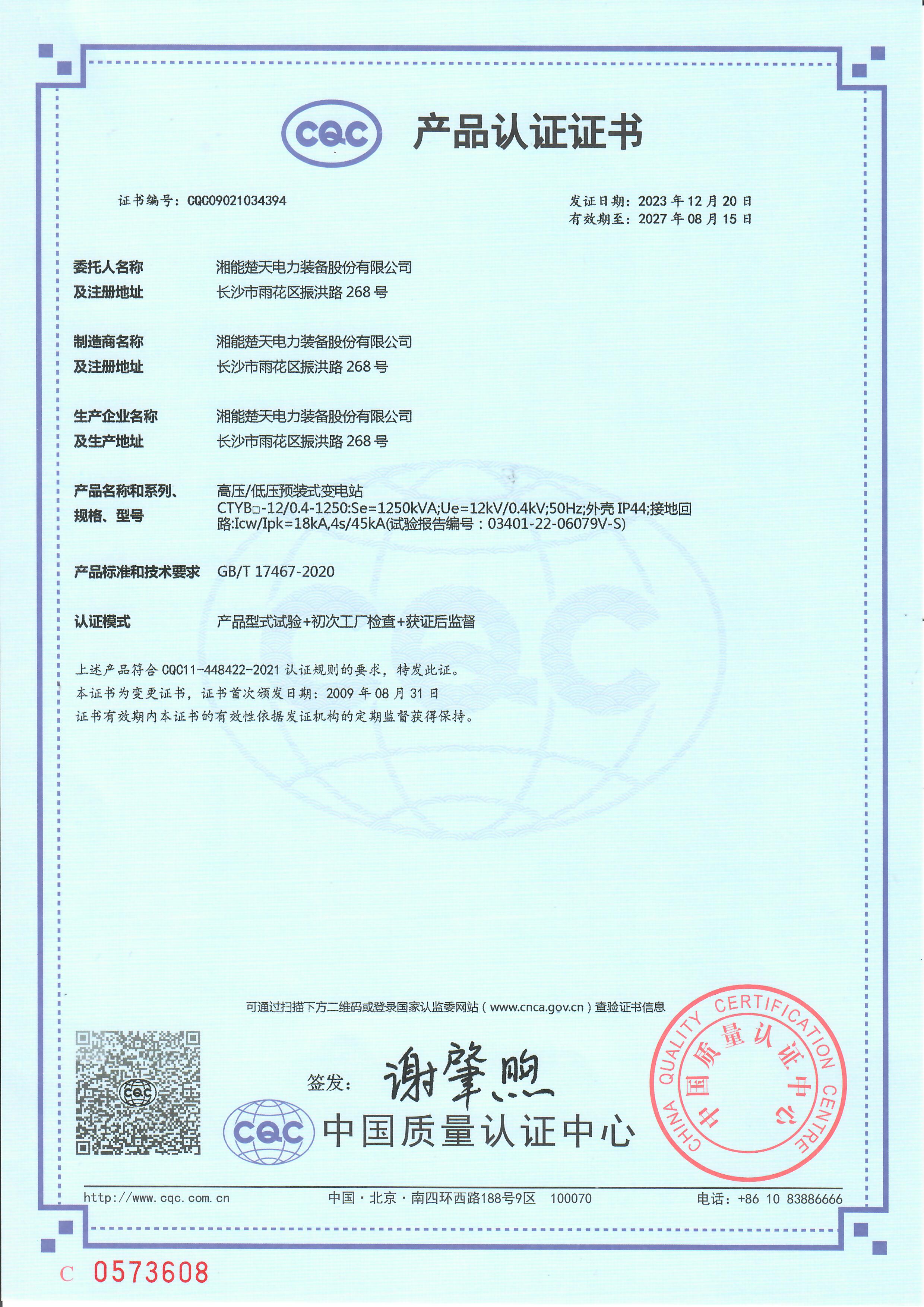 高壓/低壓預裝式變電站 產品認證證書 -