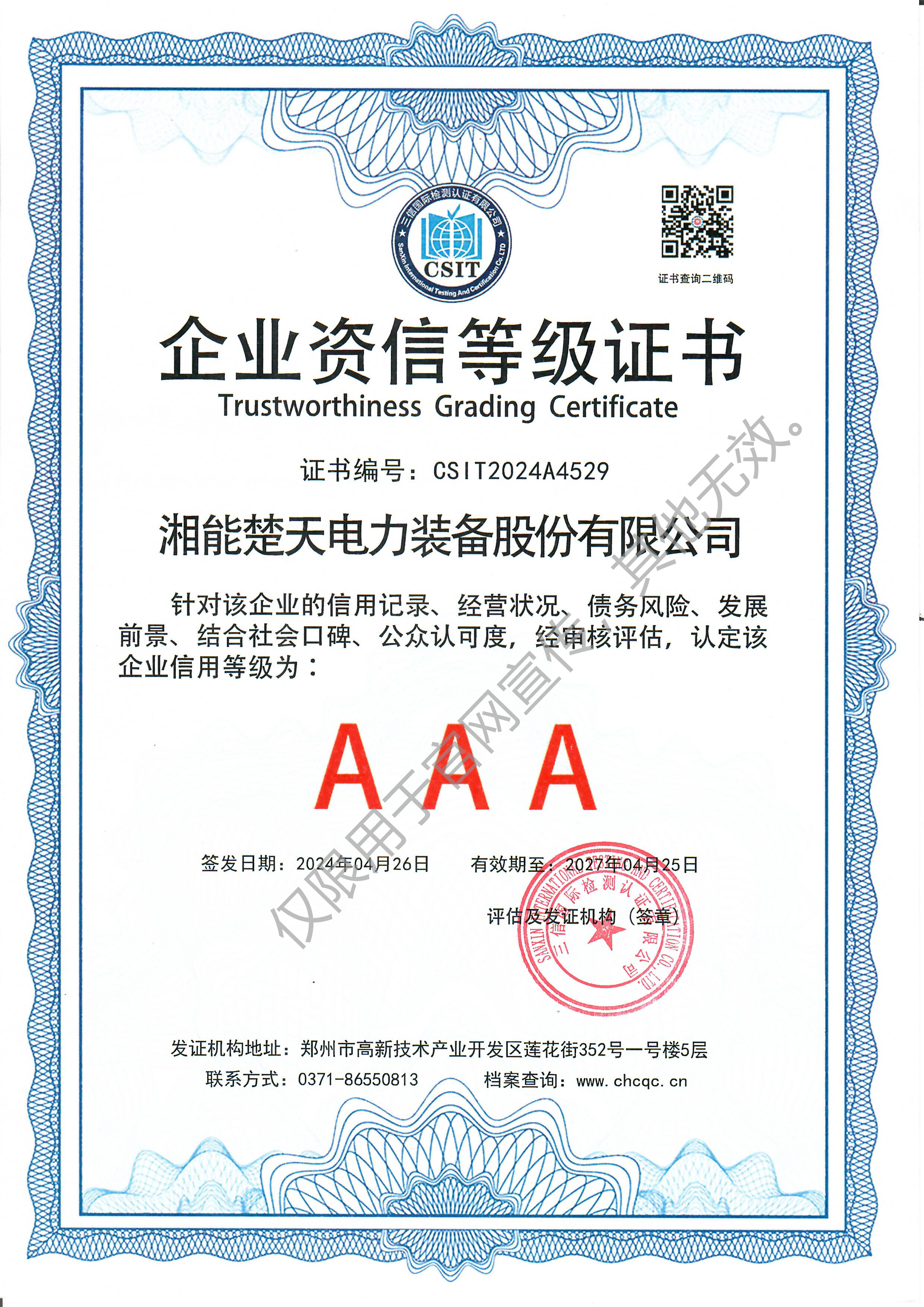 AAA 重質量守信用證書(裝備) -