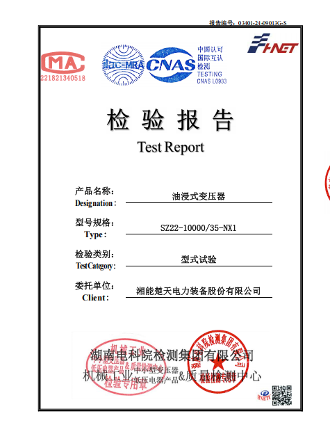 檢驗報告(S油浸式變壓器型號SZ22-10000-35-NX1) -