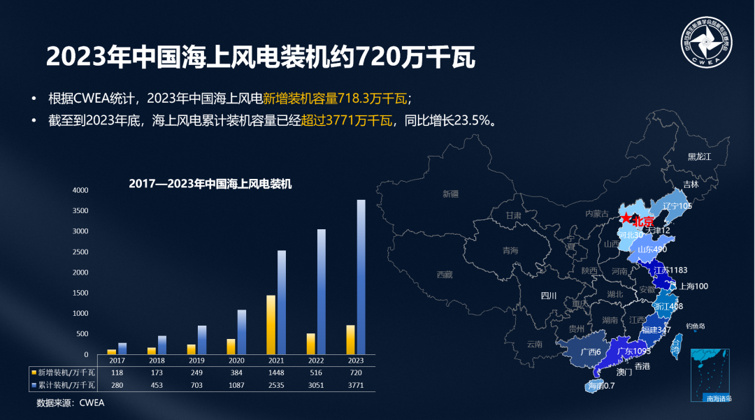 “十四五”前期,我國(guó)實(shí)現(xiàn)了海上風(fēng)電穩(wěn)步發(fā)展,CWEA數(shù)據(jù)顯示,2023年度海上風(fēng)電新增裝機(jī)容量718.3萬(wàn)千瓦,累計(jì)裝機(jī)容量已經(jīng)超過(guò)3771萬(wàn)千瓦,同比增長(zhǎng)23.5%。
