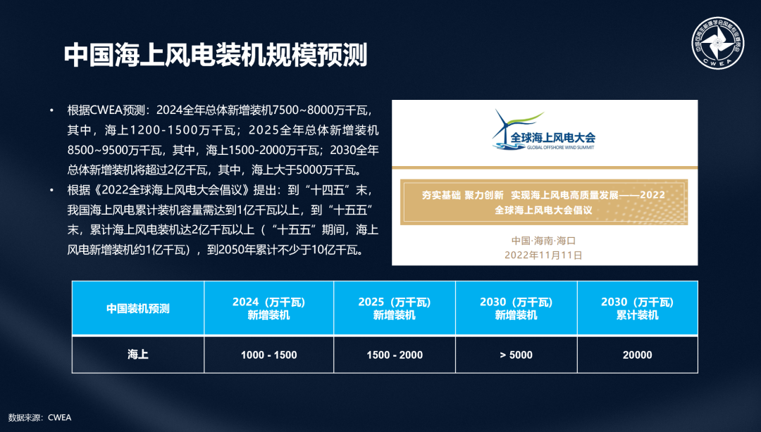 CWEA研究顯示,海上風(fēng)電規(guī)劃發(fā)展?jié)摿薮?,“十四五”期間,中國(guó)沿海地區(qū)海上風(fēng)電規(guī)劃容量約5500萬(wàn)千瓦。預(yù)計(jì)2024全年總體新增裝機(jī)7500~8000萬(wàn)千瓦,其中,海上1200-1500萬(wàn)千瓦;2025全年總體新增裝機(jī)8500~9500萬(wàn)千瓦,其中,海上1500-2000萬(wàn)千瓦;2030全年總體新增裝機(jī)將超過(guò)2億千瓦,其中,海上大于5000萬(wàn)千瓦。