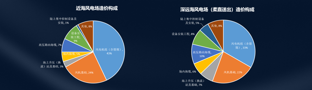 上圖可以看出,近海風(fēng)電場(chǎng)風(fēng)電機(jī)組在總投資中占比最高,隨著海上風(fēng)電向深遠(yuǎn)海開(kāi)發(fā),設(shè)備投資占比逐步降低,風(fēng)機(jī)基礎(chǔ)等建筑工程占比逐步提升;在漂浮式風(fēng)電場(chǎng)中主要設(shè)備占比已低于風(fēng)機(jī)基礎(chǔ)。另外,在深遠(yuǎn)海風(fēng)電場(chǎng)采用柔性直流輸電后,海上及陸上換流站、高壓海纜路由的占比明顯提高。其中,占比較大的機(jī)組價(jià)格下降幅度較大,2024年5月,華能半島北L場(chǎng)址海上風(fēng)電項(xiàng)目,單機(jī)12-14MW,含塔筒的折合單價(jià)已經(jīng)到了3000元左右每千瓦左右的價(jià)格。