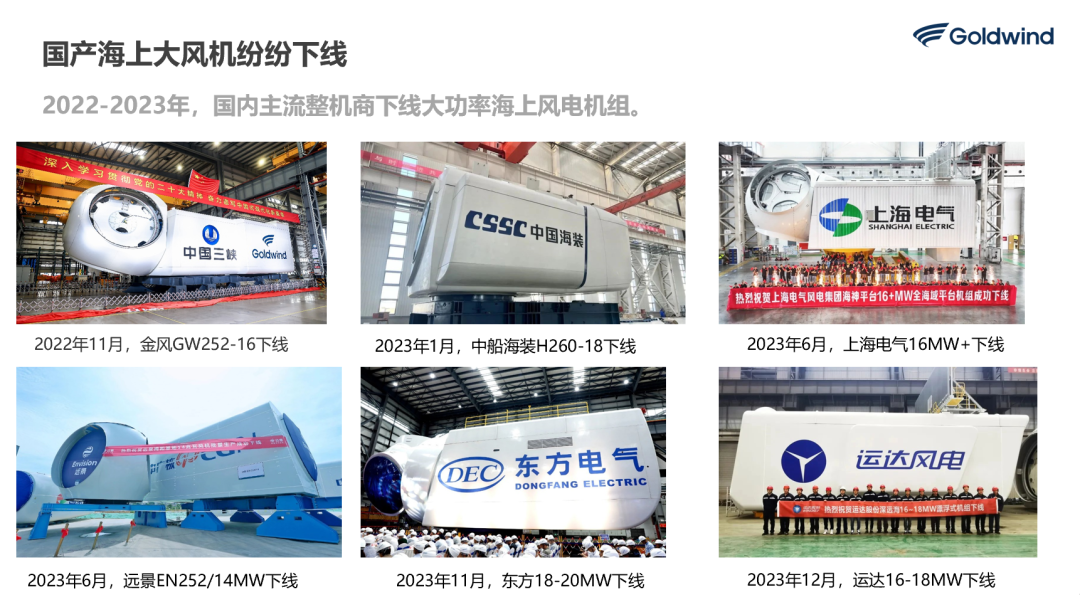 2021年海上風(fēng)電機(jī)組主流已經(jīng)在6MW到7MW水平,8MW到10MW機(jī)組已經(jīng)投入了試驗(yàn)運(yùn)行。2022年海上風(fēng)電機(jī)組主流到了8MW左右,10MW到11MW機(jī)組已經(jīng)開(kāi)始投入運(yùn)行了。2023年的12-13MW機(jī)組達(dá)到批量應(yīng)用, 2022年11月,金風(fēng)16MW機(jī)組下線了,到2023年6月在福建平潭吊裝完成,同時(shí)2023年中國(guó)海裝的18MW機(jī)組已經(jīng)下線,明陽(yáng)的18MW機(jī)組也已經(jīng)下線,10月份明陽(yáng)的22MW的機(jī)組,還有20MW的風(fēng)電機(jī)組都在持續(xù)下線。6月5日,由東方電氣自主研制的首臺(tái)18兆瓦半直驅(qū)大功率海上風(fēng)電機(jī)組,在廣東省汕頭市風(fēng)電臨海試驗(yàn)基地成功完成吊裝,是當(dāng)前全球已安裝的最大功率等級(jí)海上風(fēng)電裝備,標(biāo)志著全球已安裝的海上風(fēng)電機(jī)組功率等級(jí)邁入新的里程碑。